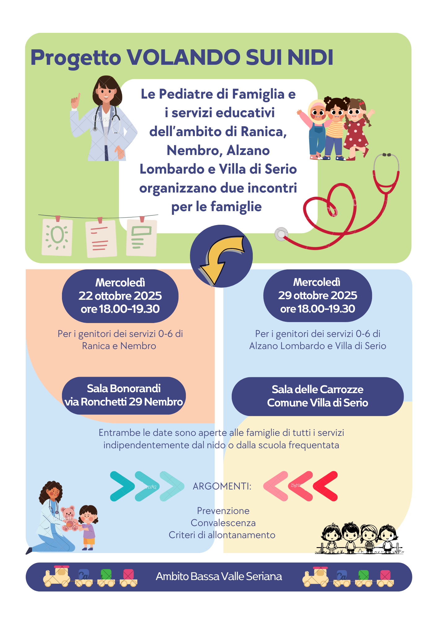 Le pediatre di famiglia e i servizi educativi dell’ambito di Ranica, Nembro, Alzano, Lombardo e Villa di Serio organizzano due incontri per i genitori con l'obiettivo di favorire integrazione tra genitori, educatrici, coordinatrici dei nidi e pediatri di famiglia per il bene dei bambini sul proprio territorio.