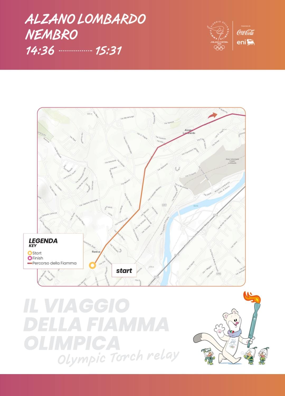 In allegato la mappa del passaggio della Fiamma Olimpica nel Comune di Alzano Lombardo al confine con il Comune di Ranica.