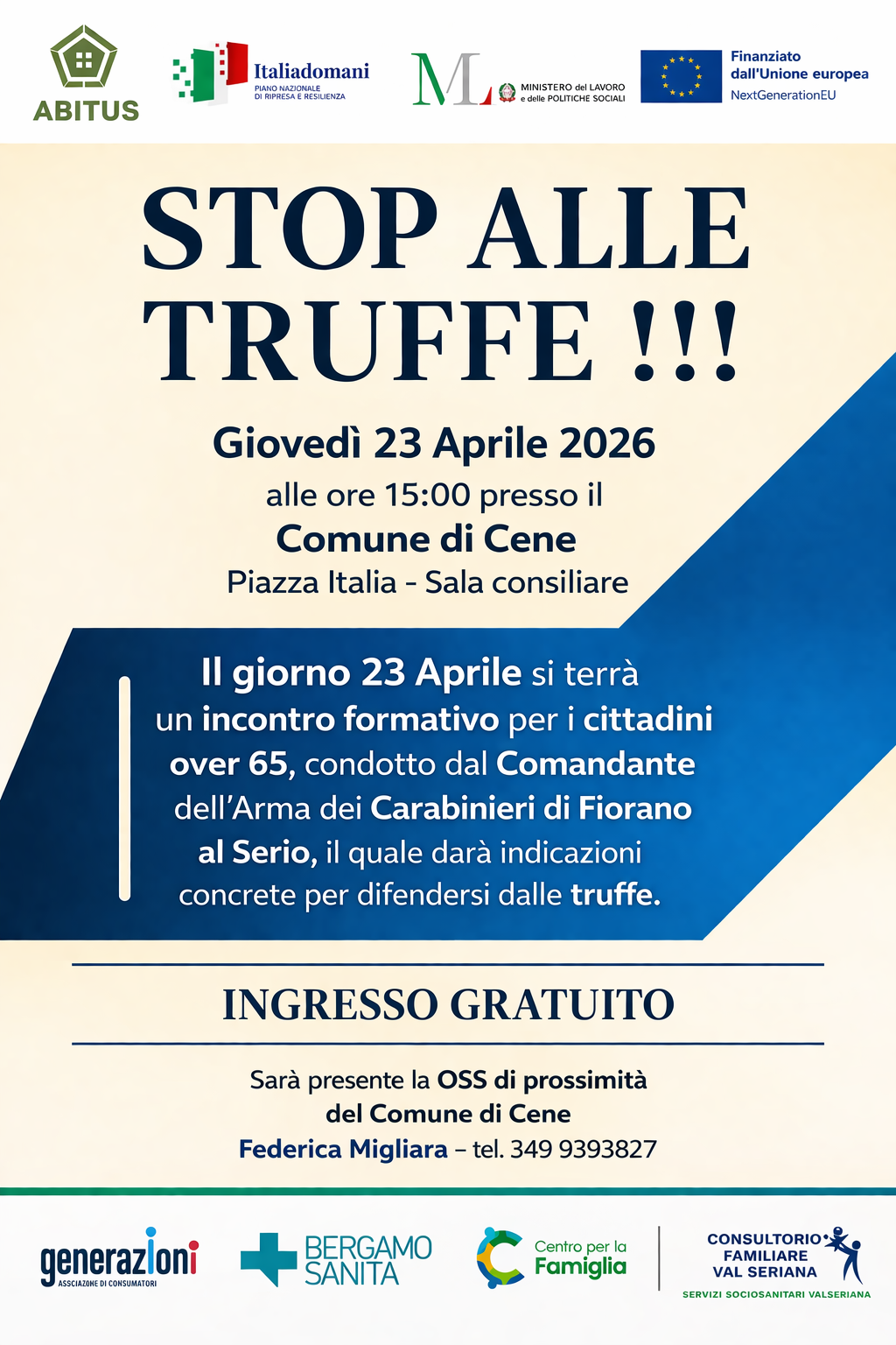 Il giorno 23 aprile 2026 presso la Sala Consiliare del Comune di Cene si terrà un incontro formativo per i cittadini over 65, condotto dal Comandante dell’Arma dei Carabinieri di Fiorano al Serio, il quale darà indicazioni concrete per difendersi dalle truffe.